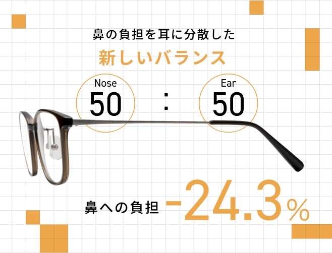 『nosefree』は、モダンの先端にあえて重りを配置することで、鼻側に偏りがちな負荷を後方(耳側)へ分散しています。前(鼻)と後ろ(耳)で重さをバランスよく支える設計により、メガネ全体の重心を安定した位置に保ちます。その結果、鼻への負担を24.3%軽減し、かけた時の軽さや、鼻パッド跡のつきにくさを実現しました。