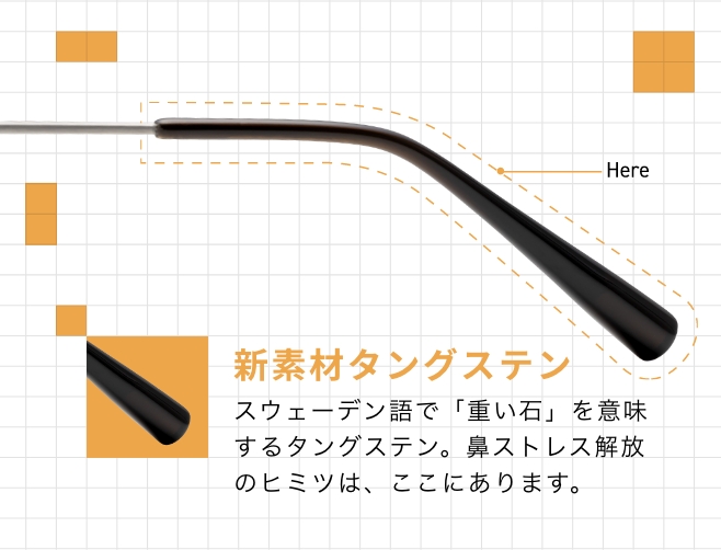 鼻の負担を軽減するための重りには、新素材「タングステン」を採用しています。金属密度が高いタングステンを使用することで、重りを従来品よりも小さく、モダンの長さも短くすることが可能になり、かけやすさとデザイン性が向上しました。