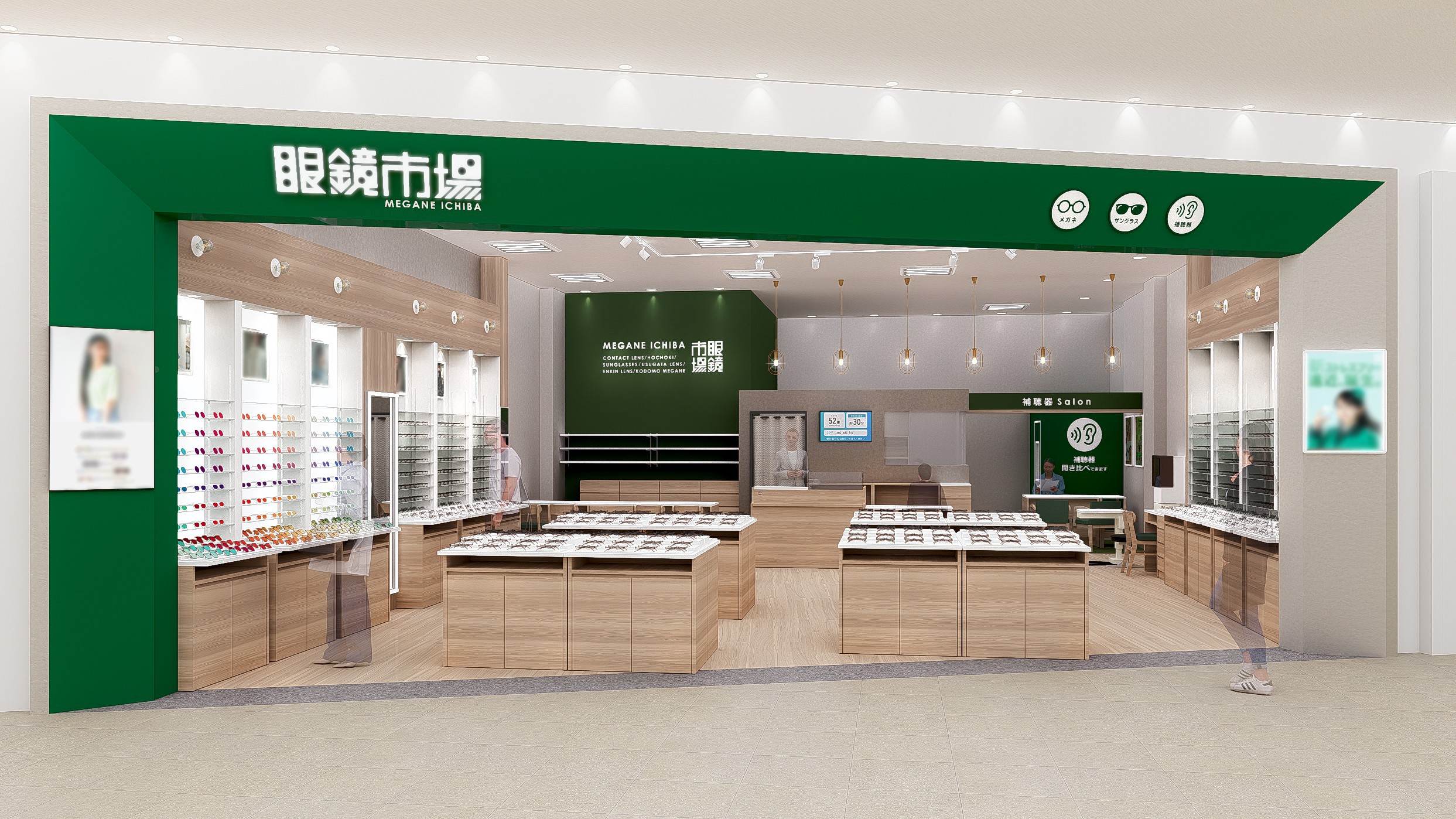 豊富な商品を一目で見渡せるよう壁面什器を増設し、視界が広がるレイアウトを採用しました。サングラスコーナーでは、白色照明を取り入れ、色味やデザインが鮮明に映ることで、お気に入りの一本を直感的に見つけやすくなっています。 さらに、店内各所に鏡を設置し、気になる商品をその場で自由に試せる環境を整え、心ゆくまでメガネ選びを楽しめる空間を実現しました。